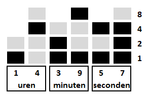 Is een cel actief, dan is ze zwart en krijgt ze een waarde volgens het binaire systeem: cel in de onderste rij = 1, in de tweede rij = 2, in de derde rij = 4, in de bovenste rij = 8.