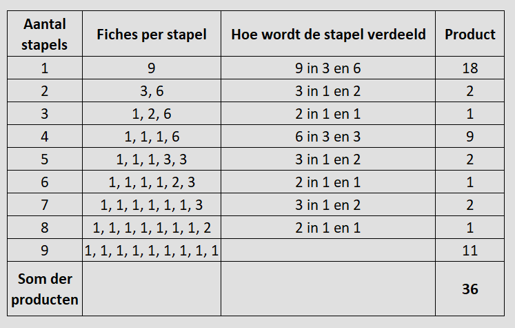 Het heeft geen belang hoe je de stapels splitst. Begin je met de 9 chips te splisen in 1 en 8, of 2 en 7, of 3 en 6, of 5 en 4, het eindresultaat zal steeds hetzelfde zijn. Ook de volgende splitsbeurten hebben geen geen belang: splits je de 6 in 3 en 3, of 2 en 4 of 5 en 1, het eindresultaat zal nog steeds hetzelfde zijn: de som van de producten zal hier steeds 36 zijn.